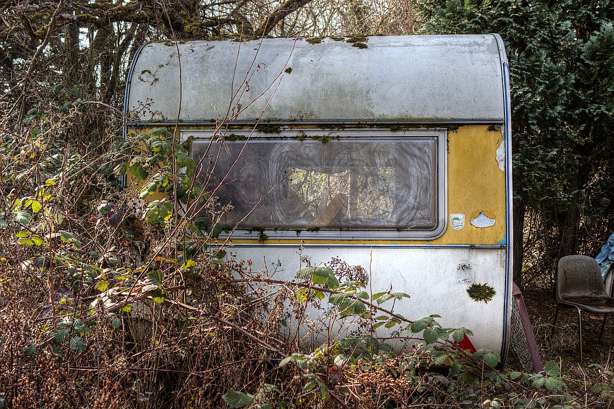Die Baracke der ehemaligen Schultafelfabrik am Falkensteiner Stock wurde abgerissen, das Gelände ist derzeit unbebaut. Der Vergleich der Vegetation zwischen den Aufnahmen von 2007 und 2019 lässt auf dem rechten neueren Foto erahnen, wo die Baracke 12 Jahre zuvor gestanden hat. | Auf einem Nachbargrundstück keimt aber bereits anderweitig der Verfall: Ein verlassener Wohnwagen auf einem Gartengrundstück. | |||||||