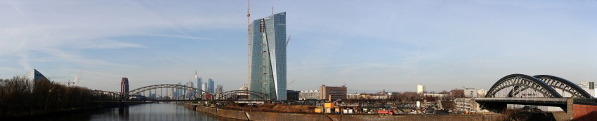Neubau der EZB im Januar 2014 eingerahmt von der Deutschherrnbrücke (links) und der wiedererrichteten Honsellbrücke (rechts): | ||||||||||